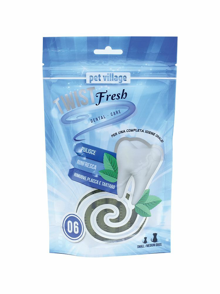 Gli snack dentali 360° Bones riducono la formazione del tartaro grazie all’azione sinergica della loro forma speciale e della loro composizione pulente. Gli snack dentali TWIST Fresh aiutano a prevenire placca e tartaro e a mantenere i denti del tuo cane sempre sani e puliti. L’utilizzo quotidiano di TWIST Fresh assicura una corretta igiene orale, offrendo una piacevole azione rinfrescante e una masticazione gradevole e giocosa. La particolare forma degli snack TWIST Fresh, abbinata alla prolungata azione meccanica della masticazione, contribuisce ad una corretta pulizia e a mantenere sano l’apparato dentale